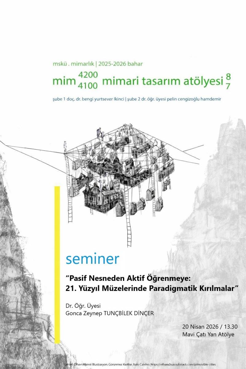 MİM 4200/4100 Mimari Tasarım Atölyesi VIII/VII dersi kapsamında 20 Nisan Pazartesi günü saat 13:30'da Mavi Çatı Yan Atölye'de Dr. Öğr. Üyesi Gonca Zeynep Tunçbilek Dinçer'in katılımıyla "Pasif Nesneden Aktif Öğrenmeye: 21. Yüzyıl Müzelerinde Paradigmatik Kırılmalar" başlıklı bir seminer gerçekleştirilecek olup, tüm öğrencilerimizin katılımına açıktır.
